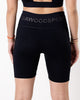 Available in black or purple, these long, high-waisted shorts are ready for action.